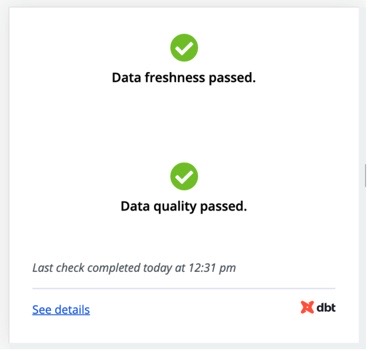 - Data health status: Data freshness passed, Data quality passed, Data may be stale, Data quality degraded.